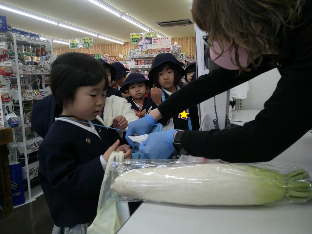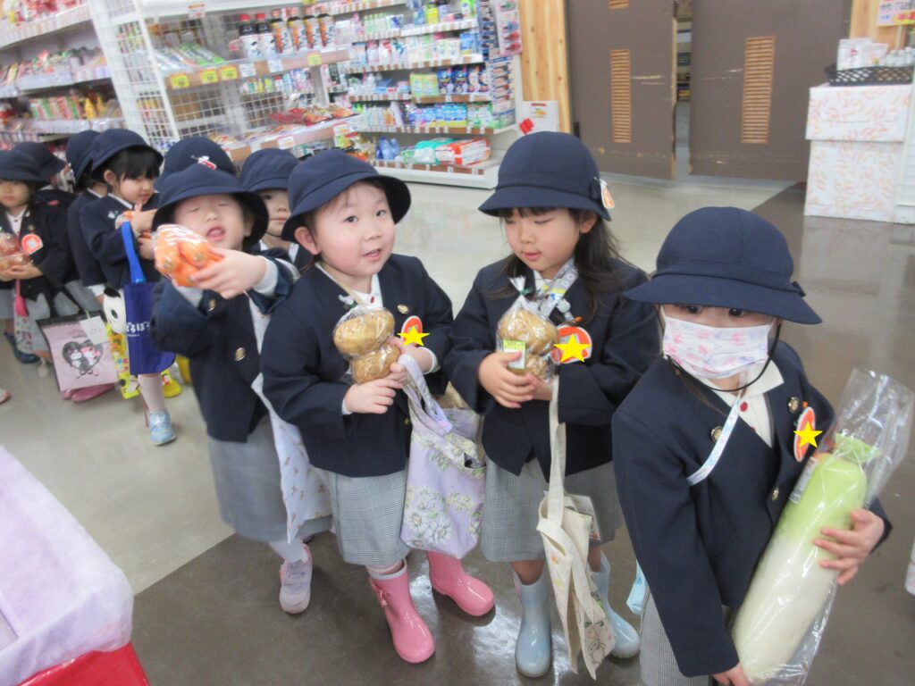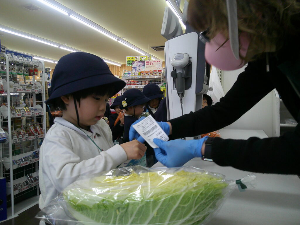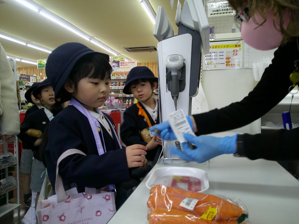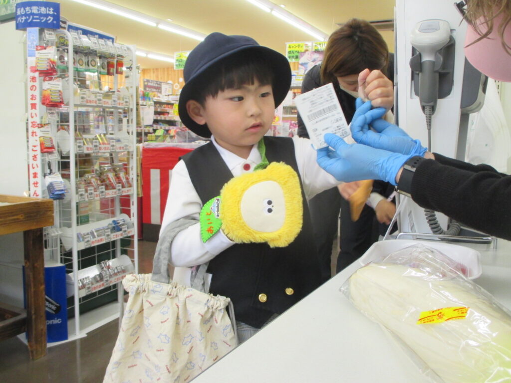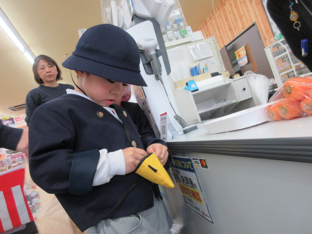 店員さんに自分から話しかけるのは勇気がいりますね!ドキドキしながら「これ下さい」「お願いします」など声を掛ける子どもたち。「○○円です」100円玉の枚数を数えながら、頑張りました!