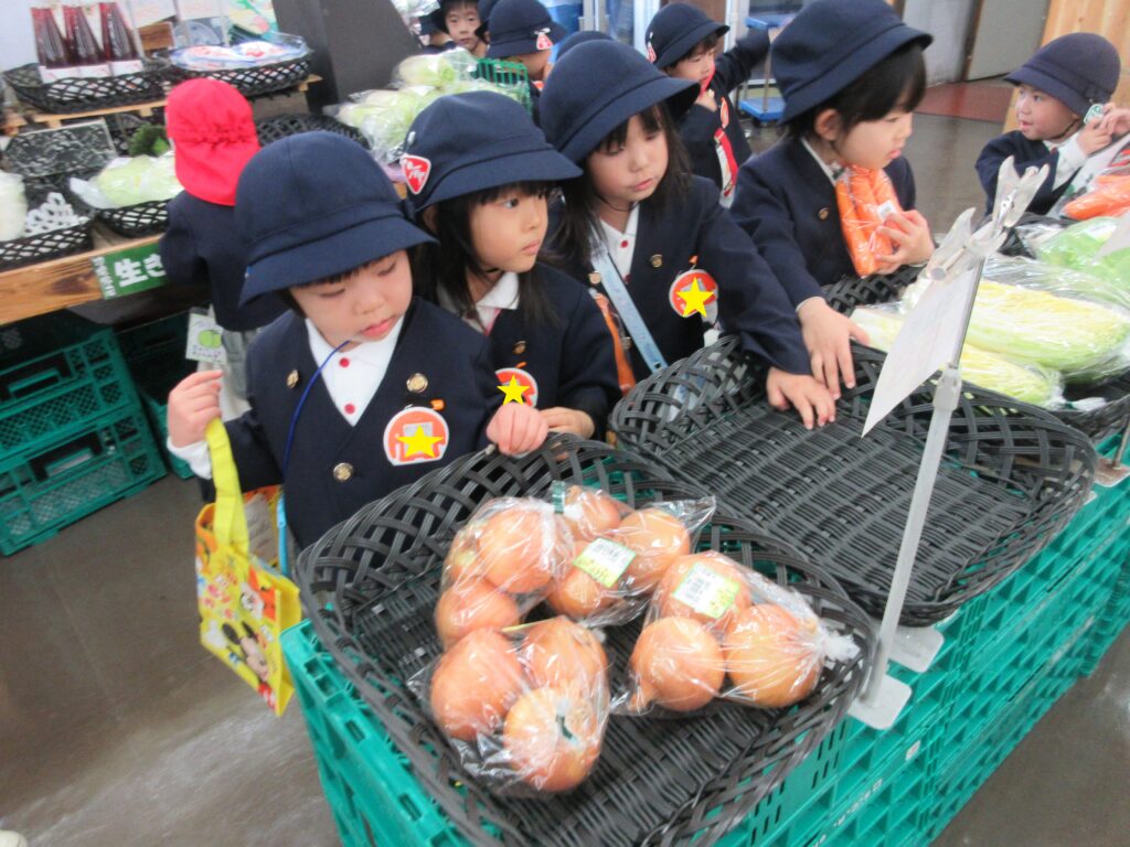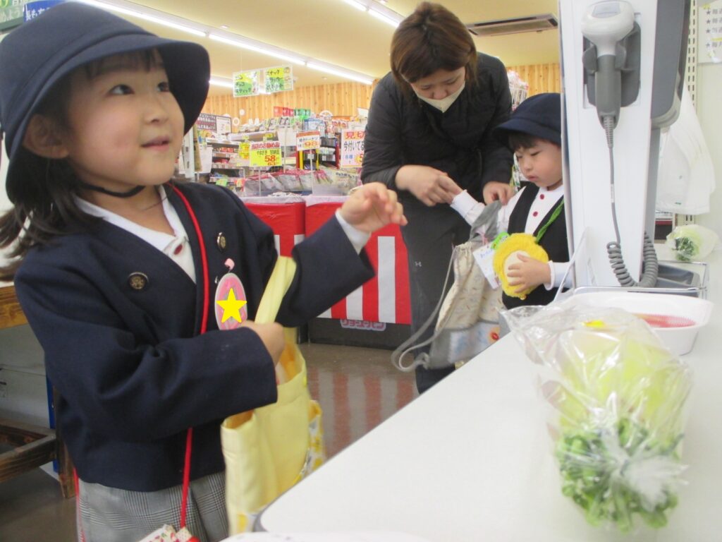 お家の方に作ってもらっていた「買い物メモ」をしっかり見て覚えて、「わたしは人参を買うよ!」「買った野菜でカレー作るんだ♪」と、すでにメニューが決まっているお友だちもいました。