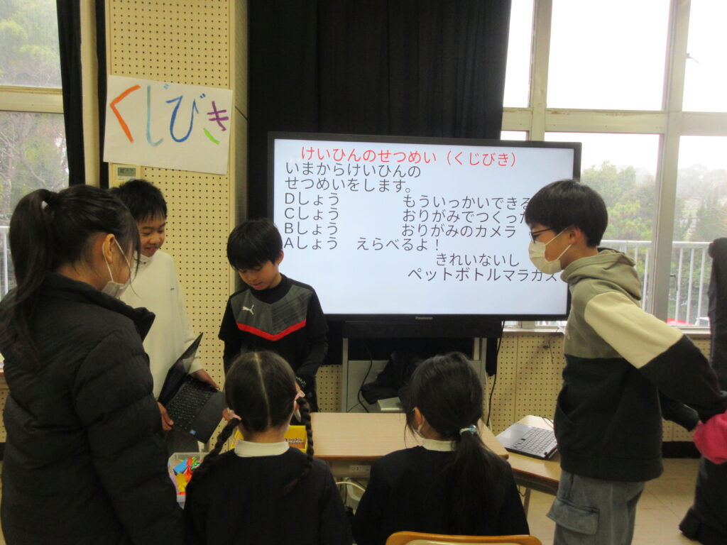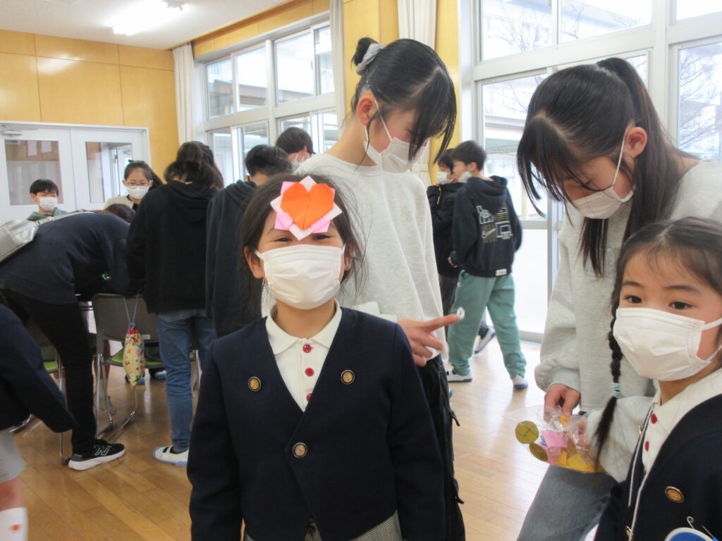 次の日は、幼稚園から近い立岩小学校に行きました。小学校に行くまでバスから道路を見ながら、「横断歩道がない、こんな道も通るかもしれないから道を渡る時は、手をあげるといいよね!」「道は、奥を通ると、危なくないよね!」など“小学生になったら・・・”を楽しそうに想像しながらお話していた子どもたちでした。小学校に着くと、「靴箱広いねー!」「小学校おっきーい!」と目をキラキラと輝かせていました。今回は、なんと5年生のお兄さん、お姉さんが各クラスで子どもたちが喜べる物を企画してくれて、素敵なプレゼントをもらったり、ゲームをして楽しむことができました。