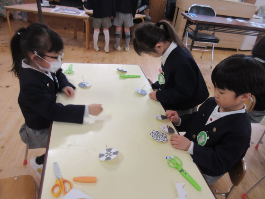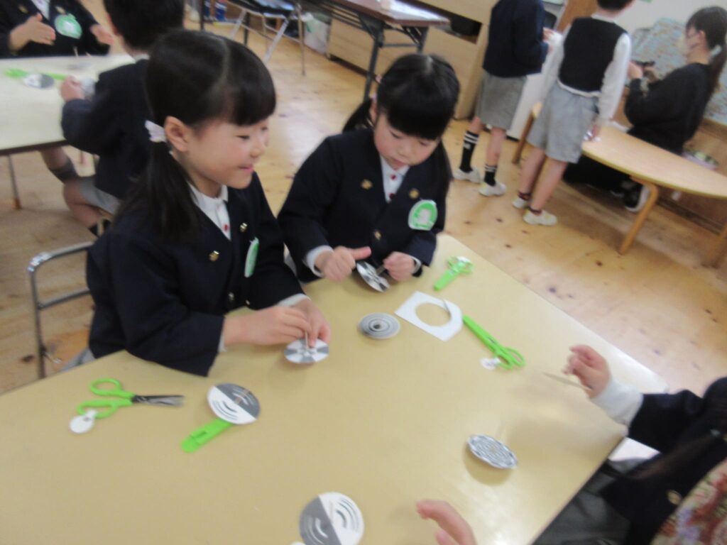 そして金曜日には、最後の理科実験教室!はさみで型を切って、コマを作りました!