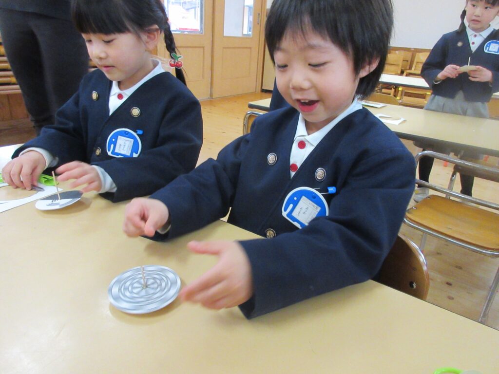 部屋の明るさなどでコマの色も変わって、青や赤に変身するコマに大興奮の子どもたち🌟